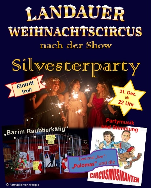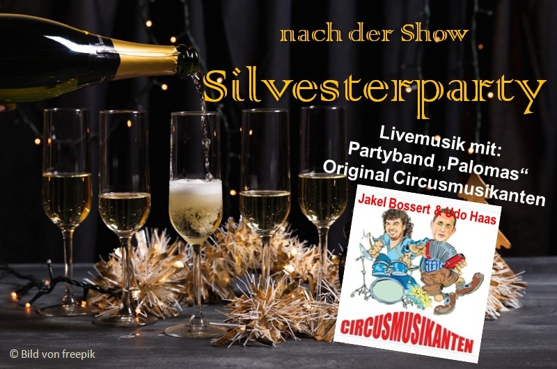Nach der Abendvorstellung beginnt gegen 22 Uhr die Silvesterparty im Weihnachtscircus. Zwei Live-Bands sorgen dieses Mal für Stimmung. Die „Bar im Raubtierkäfig“ versorgt mit Sekt, Bier vom Faß und leckeren Drinks die Gäste und das leckere Gastronomie-Angebot lässt niemanden Hunger leiden.